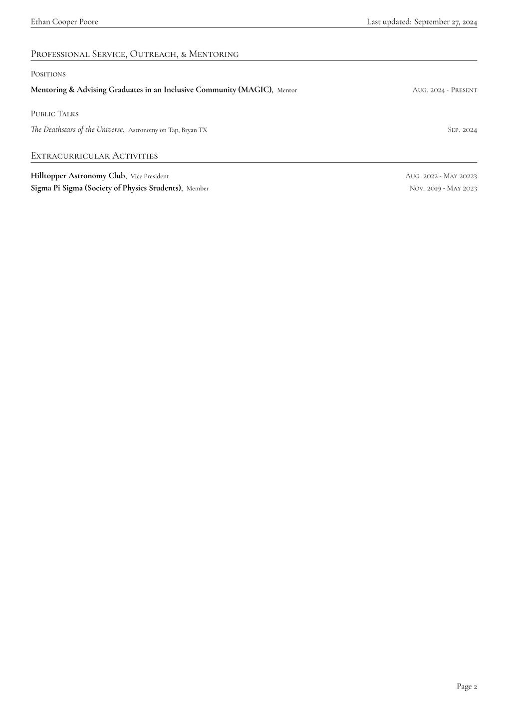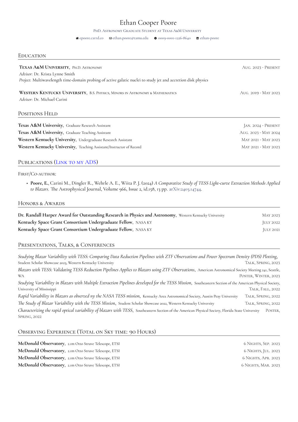 Currently, I'm a astronomy graduate student at Texas A&M University working with Dr. Krista Smith. My primary projects are studying Blazar variability with TESS simultaneous ground-based observing at the McDonald Observatory using the Exoplanet Transmission Spectroscopy Imager (ETSI) instrument developed by the Astronomical Instrumentation Laboratory at TAMU.I have been utilizing the incredible timing capabilities of the Neutron star Interior Composition explorER (NICER) to investigate quasi-periodic oscillations within Active Galactic Nuclei (Paper coming soon!). I am also utilizing NICER to probe the spectral and flux variability of a variety of other AGN targets.My most recent addition to my projects include modeling and probing Dual-AGN systems with Vera C. Rubin Observatory (LSST).